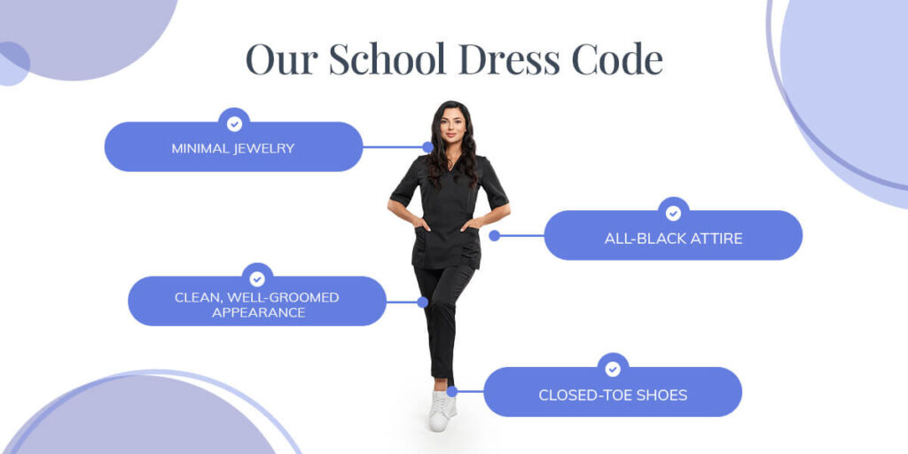 Wear professional, all-black attire with closed-toe shoes. Avoid excessive jewelry and ensure your appearance is clean and well-groomed. If you’re unsure whether something is appropriate, contact the school in advance for guidance.
